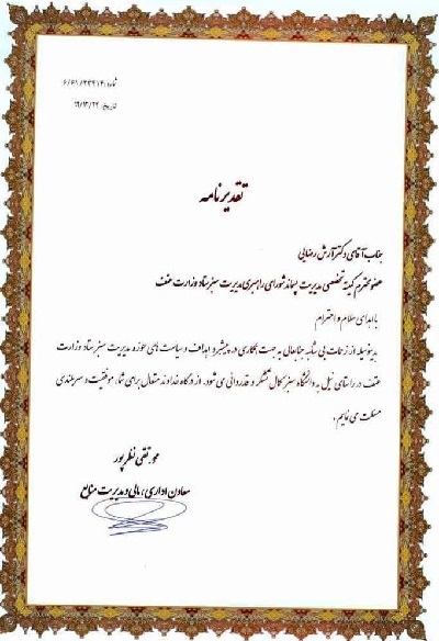 دکتر محمدتقی نظرپور معاون اداری، مالی و مدیریت منابع وزارت علوم، تحقیقات و فناوری با اهداء تقدیرنامه از زحمات دکتر آرش رضایی عضو کمیته تخصصی مدیریت پسماند شورای راهبری مدیریت سبز آن وزارت خانه تقدیر و تشکر کرد.
